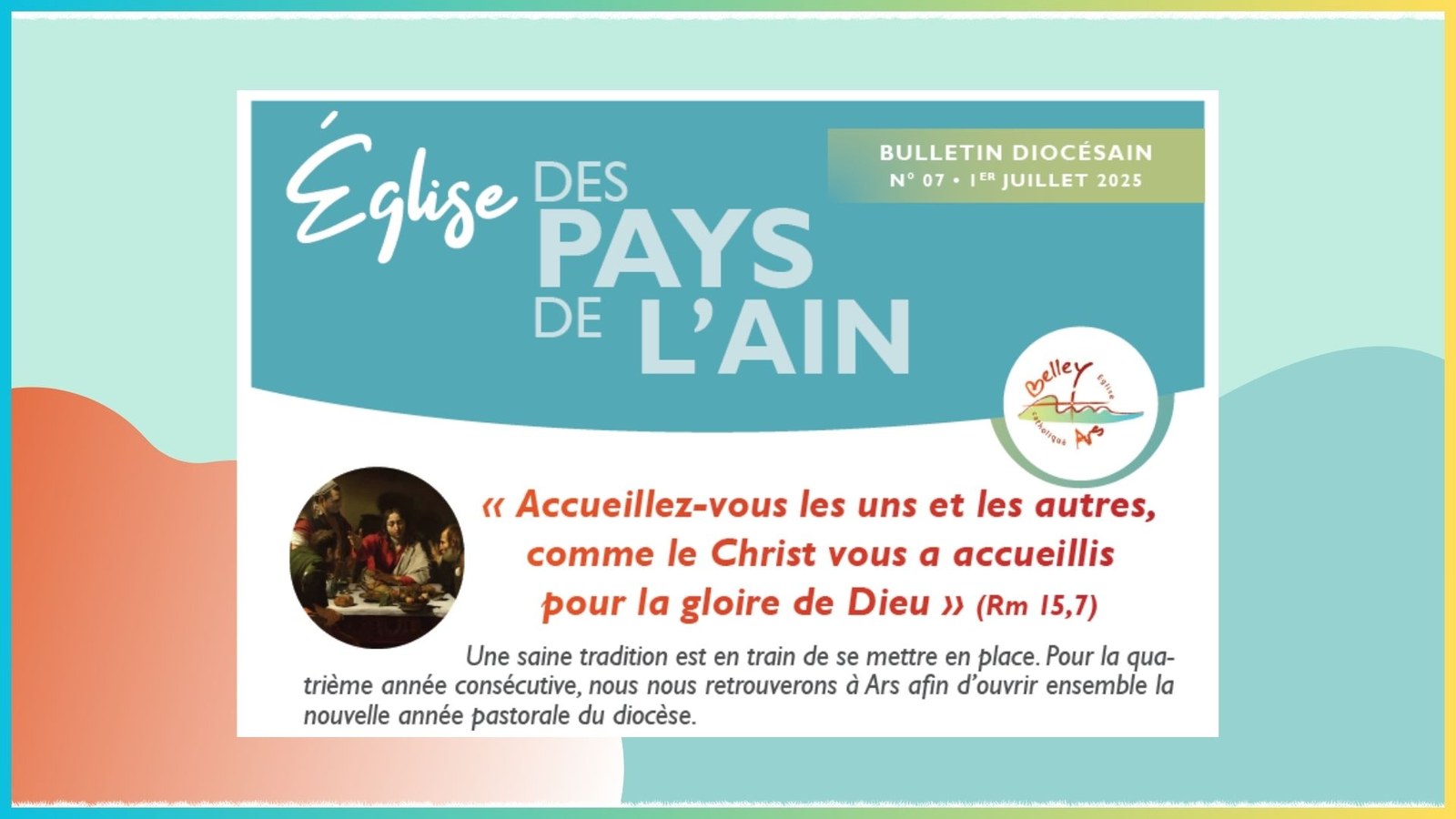 Bulletin diocésain : EPA du mois de Juillet 2025. Dans ce bulletin officiel du diocèse de 2025 retrouvez les informations officielles, la vie du diocèse et l'agenda de l'évêque et le calendrier des événements à venir. Un numéro à télécharger en pdf sur le site du diocèse ou à récupérer en exemplaire papier à l'évêché ou sur demande au service communication : communication@belley-ars.fr .