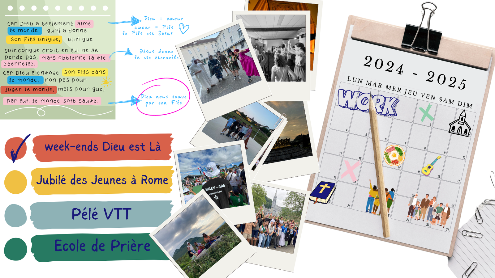 Cette année aura lieu un camp des jeunes à Lourdes pour participer au pèlerinage diocésain, du 25 au 31 juillet 2025. Les collégiens vivront un camp sous tente, au Village des jeunes, pour louer, adorer, découvrir Jésus par. Ils participeront aux temps forts du pèlerinage diocésain mais auront aussi l’occasion de rencontrer des témoins, profiter de la vie du camp et découvrir Lourdes et ses montagnes. Les lycéens logeront en dortoir, également au village des jeunes, mais vivront le pèlerinage au service de l’hospitalité et des pèlerins malades. C’est en les accompagnant qu’ils découvriront Lourdes et participeront au pèlerinage diocésain. Des animateurs de la PaJe seront avec eux au service et prendront aussi des temps de relecture de leur expérience et de détente avec eux. Pour les lycéens, un week-end de préparation a eu lieu à Bourg en Bresse, à la maison Jean- Marie Vianney, les 25 et 26 mai 2025.