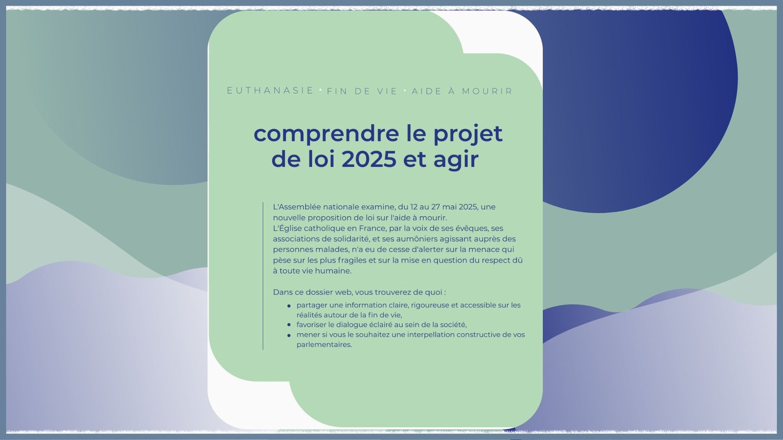 L'Assemblée nationale examine, du 12 au 27 mai 2025, une nouvelle proposition de loi sur l'aide à mourir. L'Eglise catholique en France, par la voix de ses évêques, ses associations de solidarité, et ses aumôniers agissant auprès des personnes malades, n'a eu de cesse d'alerter sur la menace qui pèse sur les plus fragiles et sur la mis en question du respect dû à toute vie humaine. Retrouvez sur ce dossier web, de quoi partager une information claire et rigoureuse et accessible sur les réalités de la fin de vie, favoriser un dialogue éclairé au sein de la société et mener si vous le souhaitez une interpellation constructive de vos parlementaires. #FinDeVie #Euthanasie