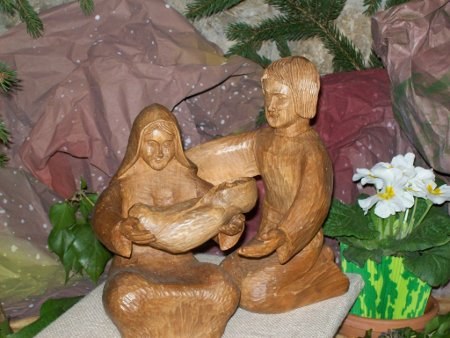 7. Peu à peu, la crèche nous conduit à la grotte, où nous trouvons les santons de Marie et de Joseph. Marie est une mère qui contemple son enfant et le montre à ceux qui viennent le voir. Ce santon nous fait penser au grand mystère qui a impliqué cette jeune fille quand Dieu a frappé à la porte de son cœur immaculé. À l'annonce de l'ange qui lui demandait de devenir la mère de Dieu, Marie répondit avec une obéissance pleine et entière. Ses paroles : « Voici la servante du Seigneur ; que tout m’advienne selon ta parole » (Lc 1, 38), sont pour nous tous le témoignage de la façon de s’abandonner dans la foi à la volonté de Dieu. Avec ce "oui" Marie est devenue la mère du Fils de Dieu, sans perdre mais consacrant, grâce à lui, sa virginité. Nous voyons en elle la Mère de Dieu qui ne garde pas son Fils seulement pour elle-même, mais demande à chacun d'obéir à sa parole et de la mettre en pratique (cf. Jn 2, 5).