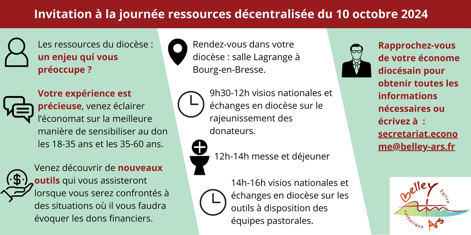 Journée ressources décentralisée Les ressources du diocèse : un enjeu qui vous préoccupe ? Votre expérience est précieuse, venez éclairer l’économat sur la meilleure manière de sensibiliser au don les 18-35 ans et les 35-60 ans.