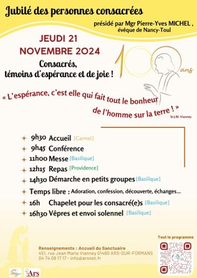 [JUBILÉ ARS 2025] -Jubilé des consacrés - Jeudi 21 novembre 2024 [JUBILÉ ARS 2025] - Jubilé des consacrés Quand le 21/11/2024 Où Sanctuaire d'Ars Contact Accueil Sanctuaire d'Ars Téléphone 04 74 08 17 17 Ajouter l'événement au calendrier vCal iCal Avec Mgr Pierre-Yves MICHEL, évêque de Nancy-Toul Suivez la journée jubilaire en direct de la chapelle du Carmel à Ars-sur-Formans : Suivez le diocèse Belley-Ars : Suivez le sanctuaire d'Ars : Plus d'informations sur cet événement…