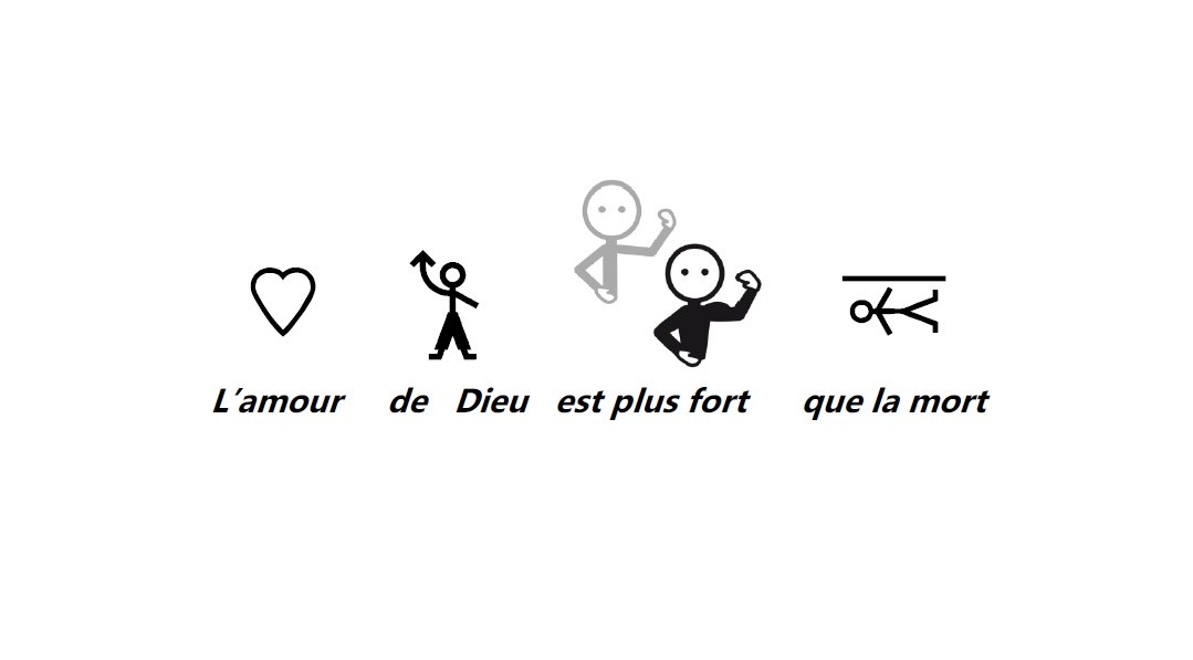- Puisque la catéchèse est pour tous, il fallait que l’annonce de Jésus-Christ puisse aussi se faire par le biais de la « CAA » et donc des pictogrammes. Certains pictogrammes du quotidien étaient facilement transposables dans le vocabulaire religieux, d’autres nécessitent des adaptations, explications … Mettre un texte en pictogrammes ne se limite pas à une traduction de mots. Cela nous invite à prendre du recul pour analyser le fond et le sens du message et c’est un formidable défi qui nous amène parfois à un profond travail d’exégèse, de théologie, très utile pour tous … pas uniquement pour ceux qui ne parlent pas !