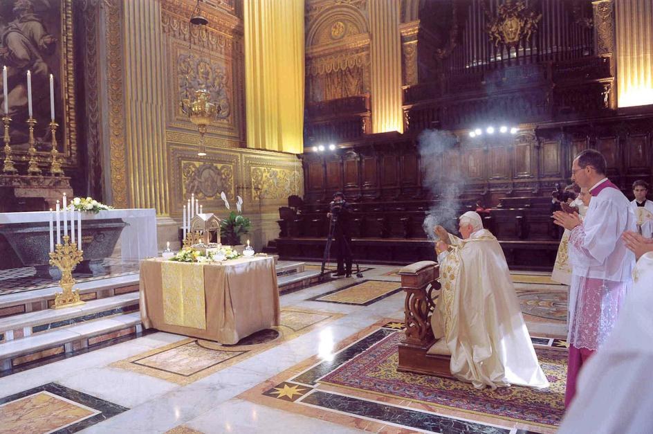 Avant que ne commence le chant des vêpres, ce vendredi 19 juin - Fête du Sacré Coeur et Journée mondiale de prière pour les prêtres - le reliquaire avait été conduit solennellement en procession dans la basilique ; il y avait une foule de prêtres, une centaine d'évêques, une trentaine de cardinaux et beaucoup de fidèles. Après que le reliquaire ait été déposé dans une chapelle latérale, le Pape est venu le vénérer. La célébration s'est poursuivie avec le chant des psaumes et par un temps d'adoration.