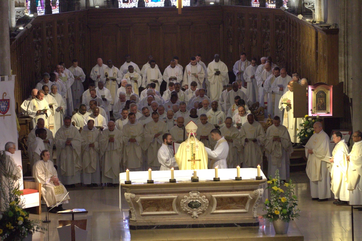 Pour terminer je vous invite tous, prêtres, diacres, religieux, laïcs, à vous interroger sur ce que vous devez et pouvez faire pour promouvoir des vocations de prêtres diocésains. On multiplie aisément les prières pour les vocations. C’est bien. Mais rassurez-vous, Dieu n’est pas sourd ! Ne faudrait-il pas aussi et surtout changer nos comportements, afin de fournir un terreau propice à l’éclosion et à la croissance de vocations ? Tous les prêtres ici présents pourraient certainement témoigner qu’à l’origine de leur vocation il y a eu la plupart du temps des figures de prêtres. Aussi je pose la question : est-ce que nous, prêtres, donnons envie à des enfants, adolescents et jeunes adultes, de devenir prêtres ? Est-ce que nous laissons suffisamment transparaître au quotidien ce qui nous fait vivre et nous rend heureux ? Est-ce que de votre côté, vous, parents et grands-parents, proposez la prêtrise comme une voie de bonheur possible, à côté de celle du mariage et de la vie professionnelle ? Est-ce que vous manifestez la nécessité du ministère des prêtres ? Est-ce que vous faites percevoir la beauté et l’accessibilité de cette aventure spirituelle ? Et, plus radicalement, est-ce que, les uns et les autres, nous apprenons aux enfants et à tous, à être de véritables disciples du Christ ?