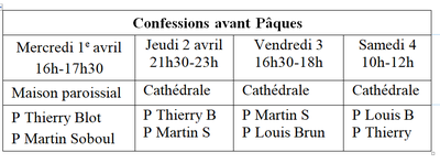 HORAIRE DES MESSES SEMAINE SAINTE Publié le 29/03/2026 HORAIRE DES MESSES SEMAINE SAINTE Je 2 20h Cathédrale la Cène du Seigneur Ve 3 8h30 Cathédrale office des ténèbres 15h Cathédrale chemin de croix 20h Cathédrale office de la Passion Sa 4 8h30 Cathédrale office des ténèbres 21h Cathédrale vigile pascale Ménage de Pâques à la cathédrale Le lundi 30 mars à 14h, toutes les bonnes volontés sont attendues à la cathédrale pour la rendre belle avant Pâques. Merci d’apporter vos balais, chiffons, aspirateurs !
