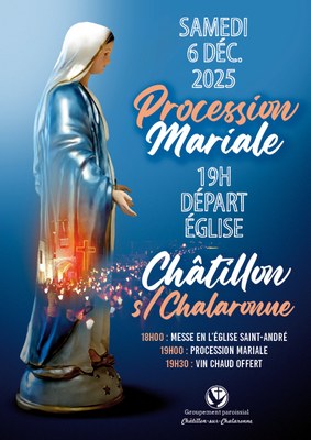 Samedi 6 décembre 2025, procession mariale illuminée pour fêter l'Immaculée Conception dans les rues de Châtillon-sur-Chalaronne. Départ 19h devant l'église Saint-André. Lumignons fournis. Vin chaud offert à tous à la cure, rue Alphonse Baudin.