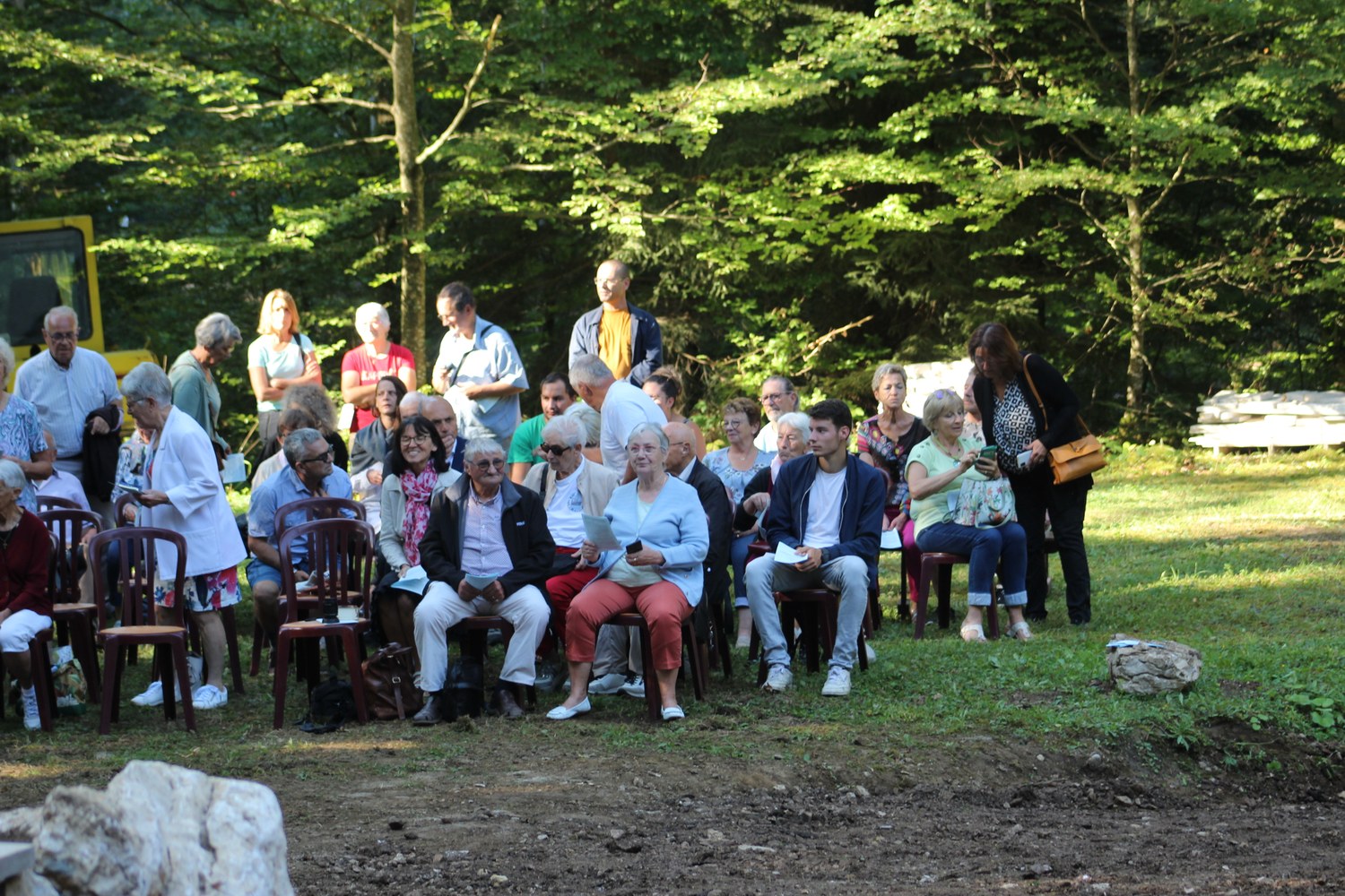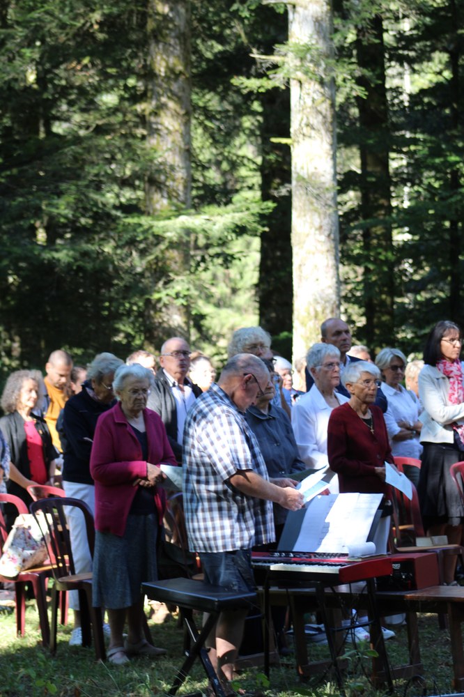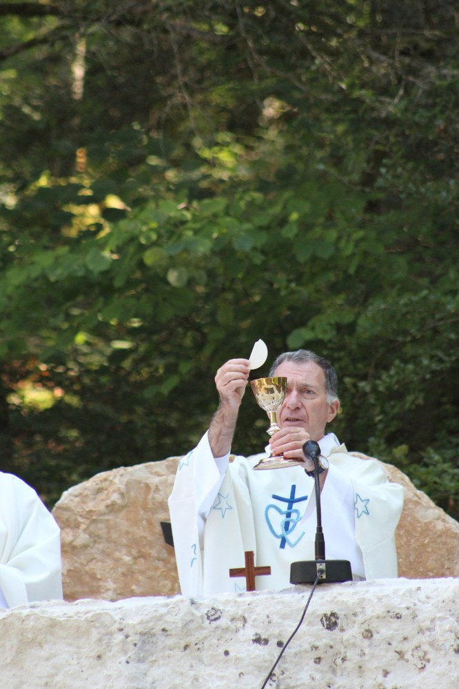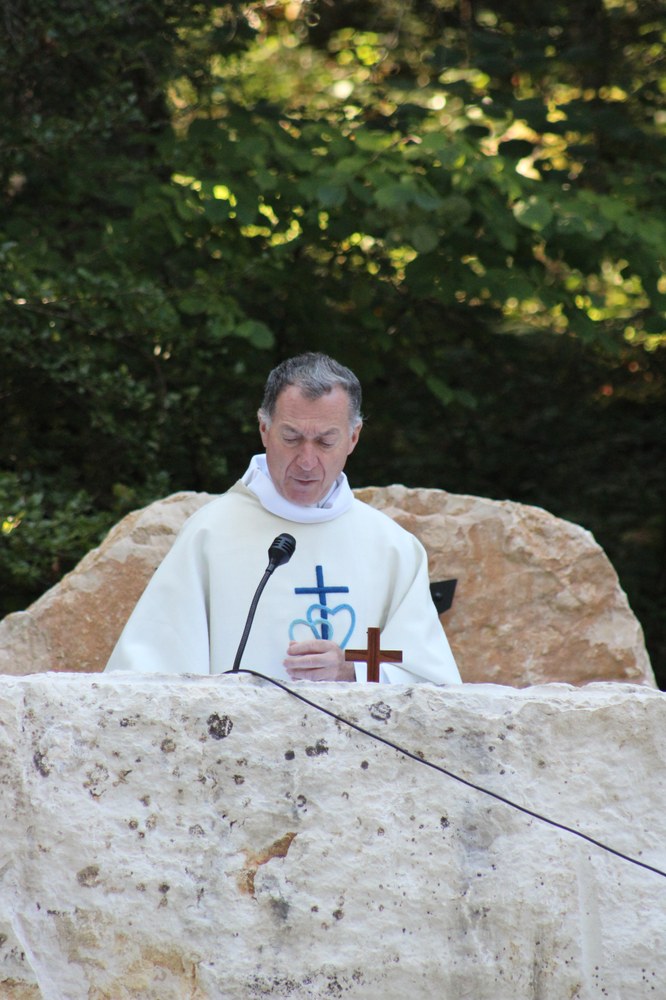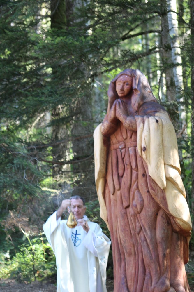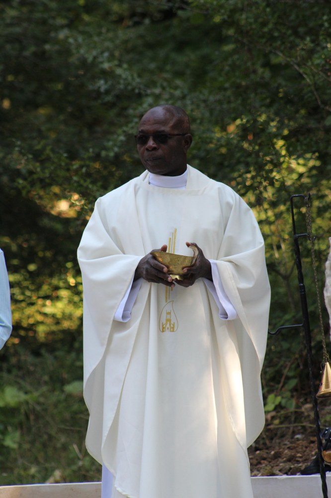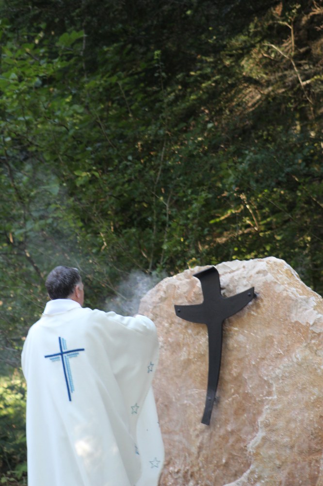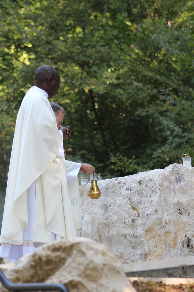 C’est ainsi que l’autel extérieur installé sur l’esplanade et la nouvelle statue ont pu être bénis par le Père Pelletier,vicaire général, invité tout exprès par le Père Rufin, à célébrer une messe sur le site pour fêter la Nativité de la Vierge.Cette manifestation organisée dans la précipitation et annoncée au tout dernier moment, a cependant rencontré un beau succès.Le temps radieux et le site ont attiré environ 60 personnes qui ,avec monsieur le maire, ont félicité chaleureusement les travailleurs en partageant des boissons à l’issue de la cérémonie.