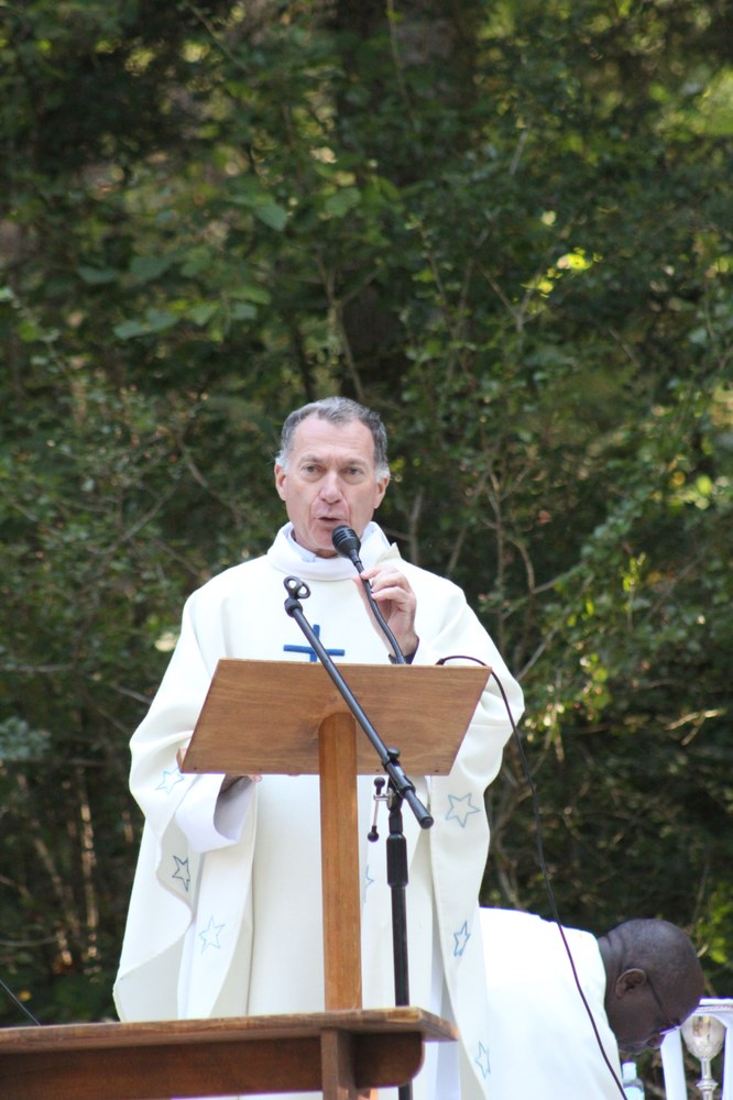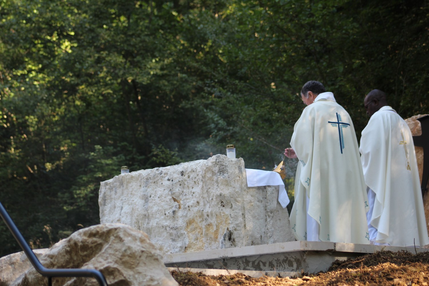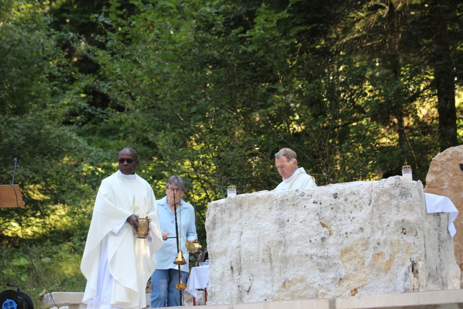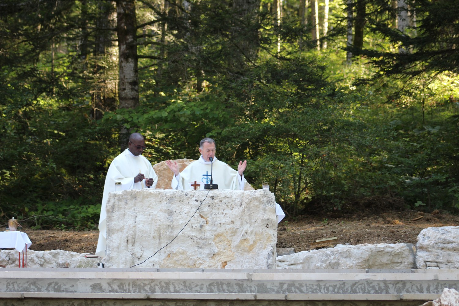 C’est ainsi que l’autel extérieur installé sur l’esplanade et la nouvelle statue ont pu être bénis par le Père Pelletier,vicaire général, invité tout exprès par le Père Rufin, à célébrer une messe sur le site pour fêter la Nativité de la Vierge.Cette manifestation organisée dans la précipitation et annoncée au tout dernier moment, a cependant rencontré un beau succès.Le temps radieux et le site ont attiré environ 60 personnes qui ,avec monsieur le maire, ont félicité chaleureusement les travailleurs en partageant des boissons à l’issue de la cérémonie.