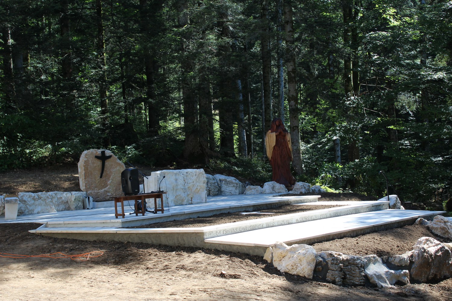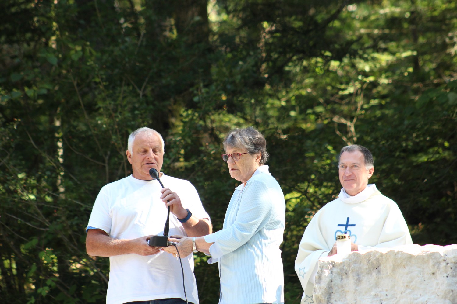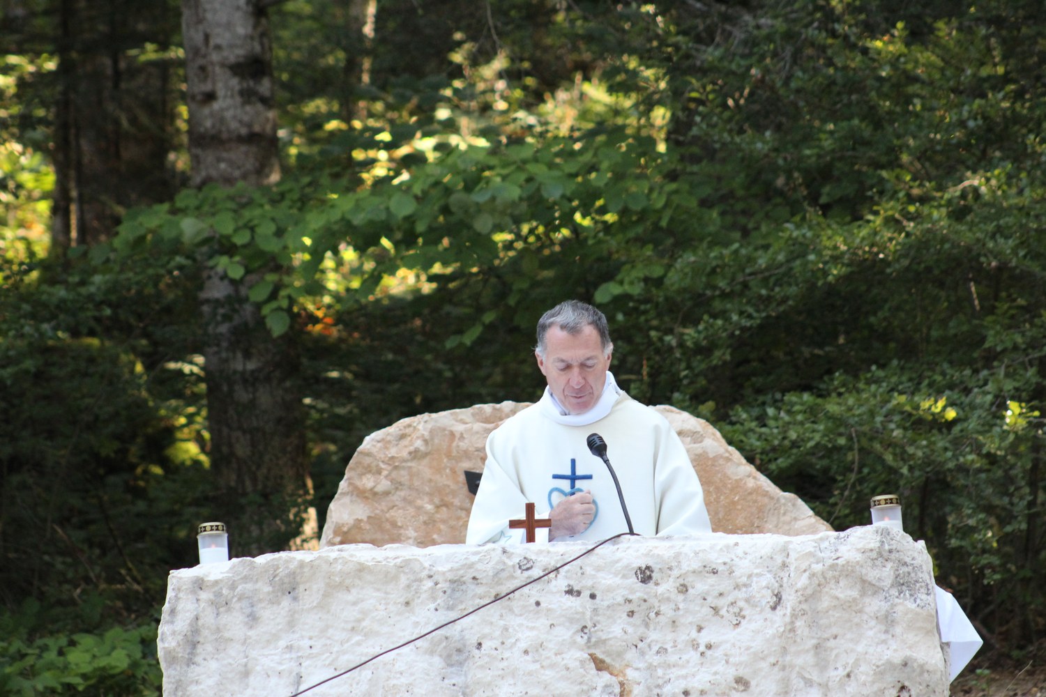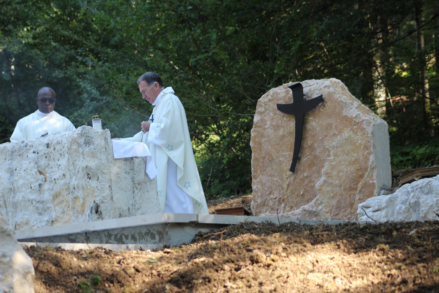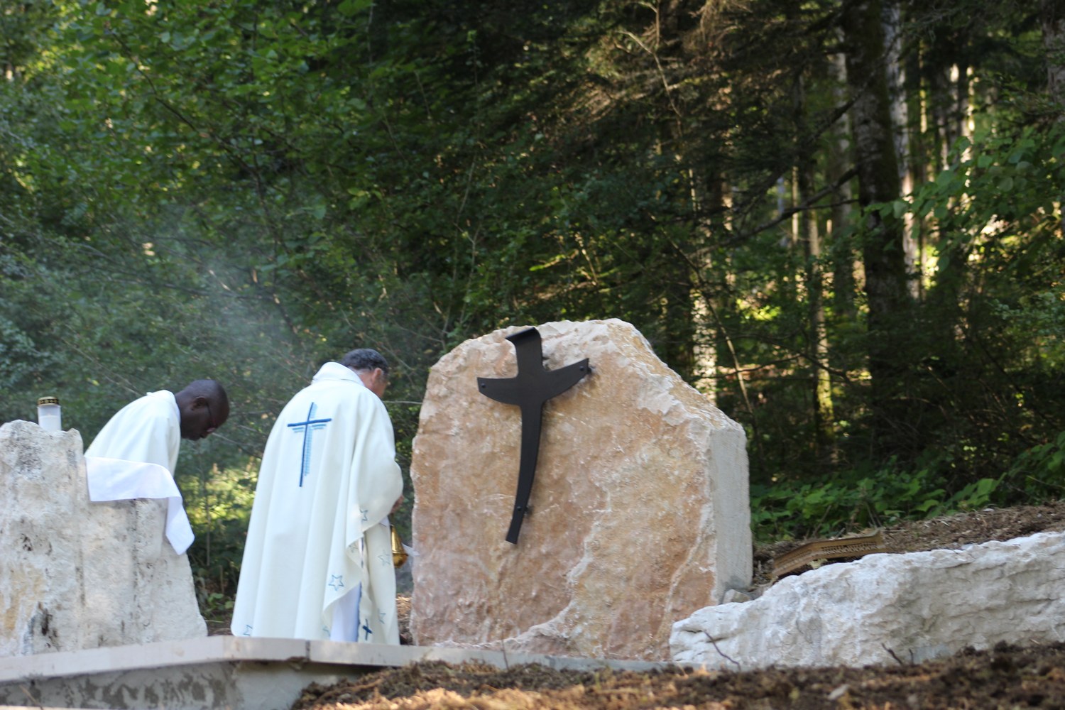 C’est ainsi que l’autel extérieur installé sur l’esplanade et la nouvelle statue ont pu être bénis par le Père Pelletier,vicaire général, invité tout exprès par le Père Rufin, à célébrer une messe sur le site pour fêter la Nativité de la Vierge.Cette manifestation organisée dans la précipitation et annoncée au tout dernier moment, a cependant rencontré un beau succès.Le temps radieux et le site ont attiré environ 60 personnes qui ,avec monsieur le maire, ont félicité chaleureusement les travailleurs en partageant des boissons à l’issue de la cérémonie.