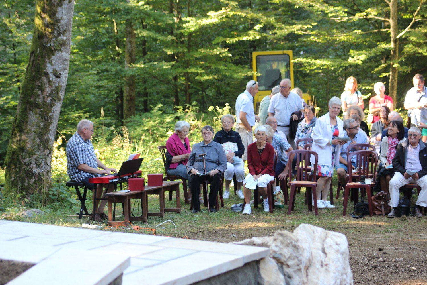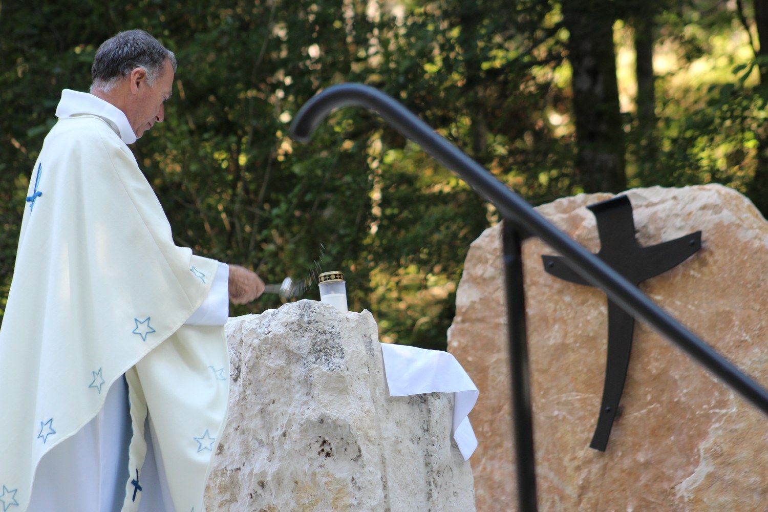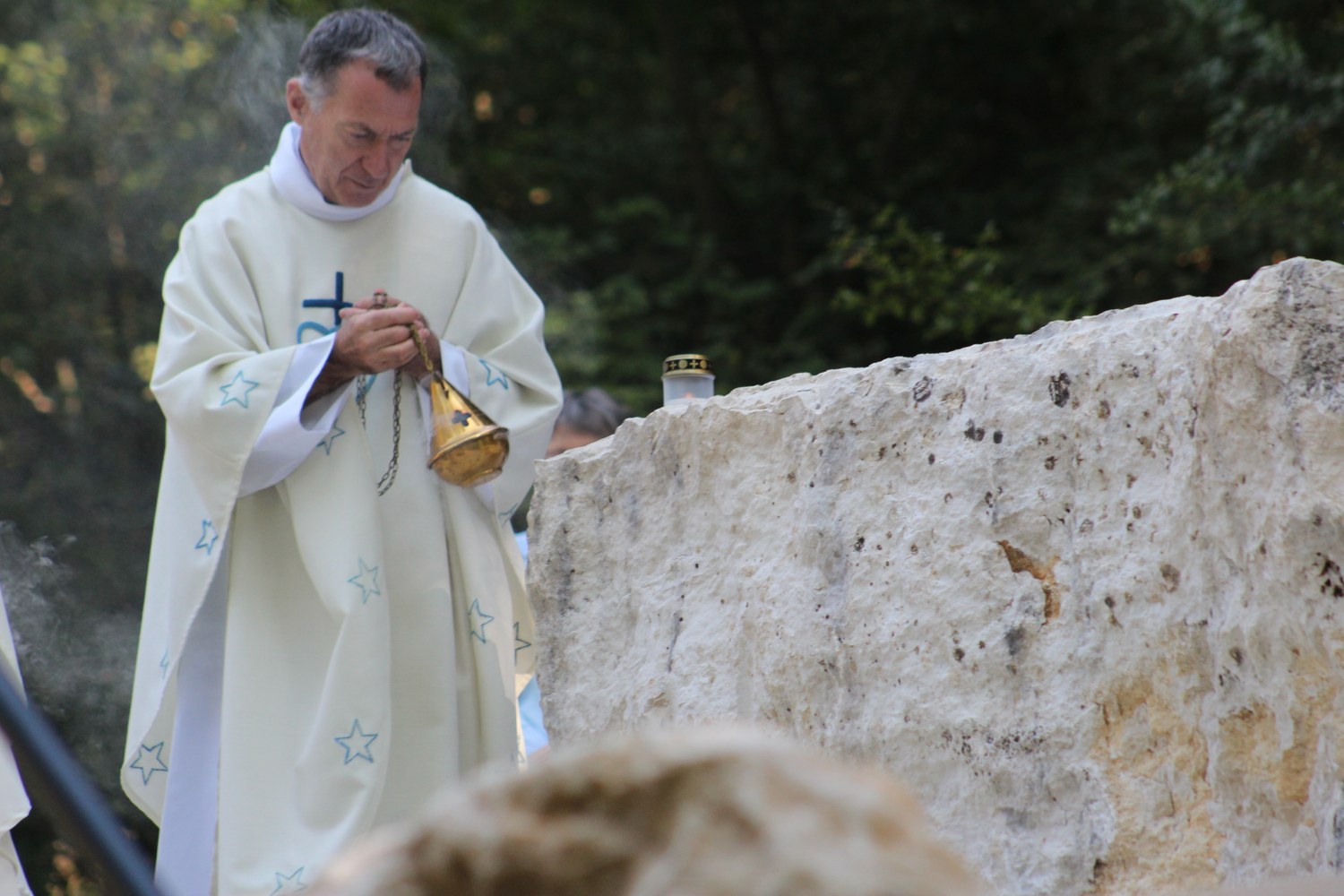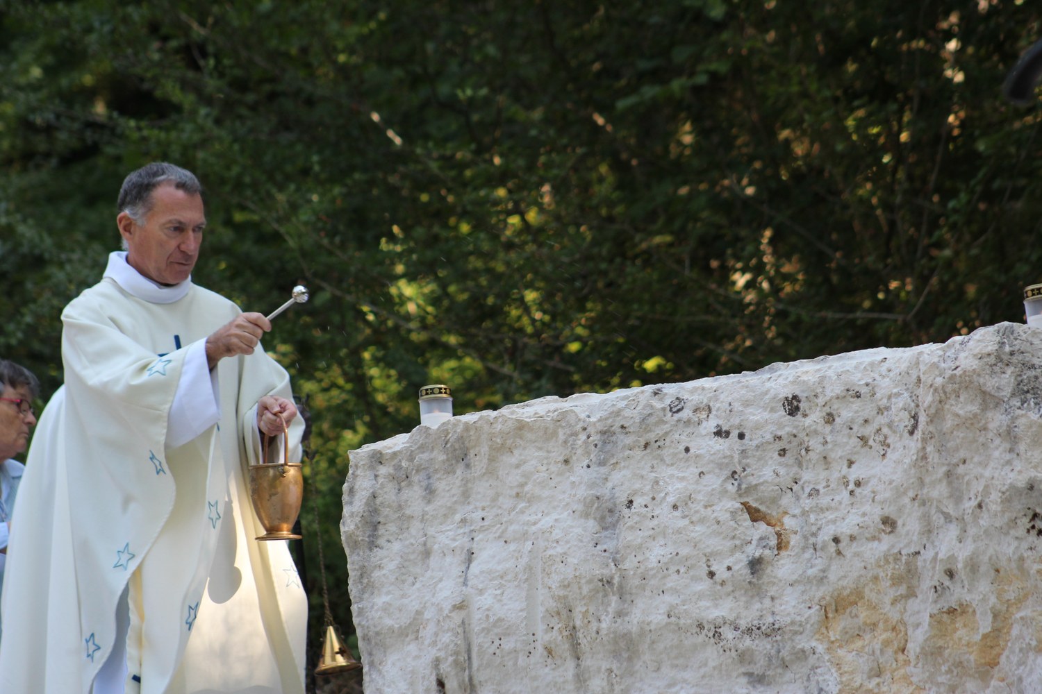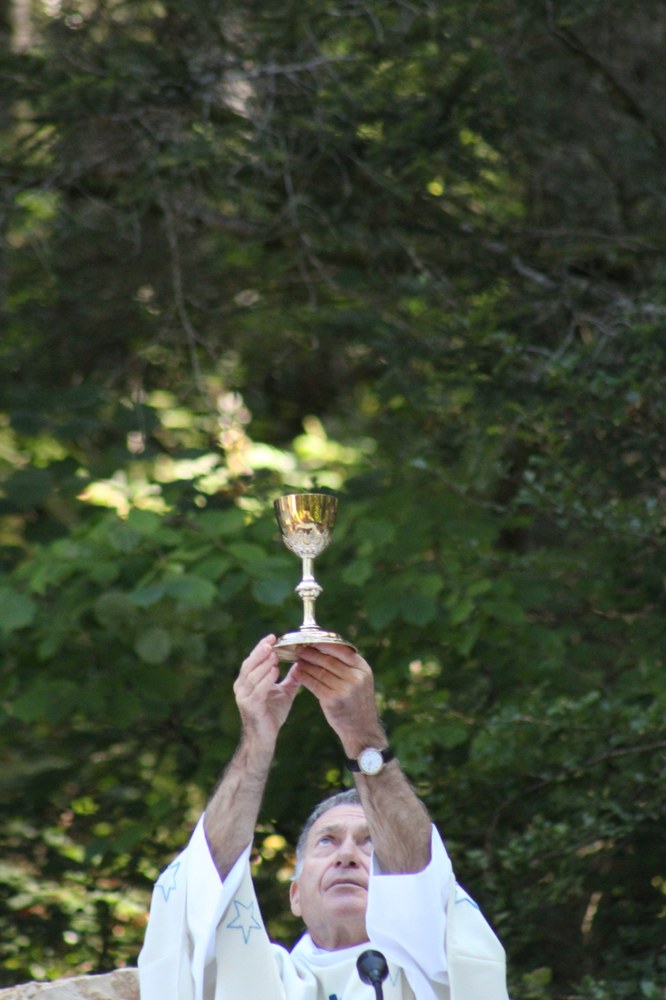 C’est ainsi que l’autel extérieur installé sur l’esplanade et la nouvelle statue ont pu être bénis par le Père Pelletier,vicaire général, invité tout exprès par le Père Rufin, à célébrer une messe sur le site pour fêter la Nativité de la Vierge.Cette manifestation organisée dans la précipitation et annoncée au tout dernier moment, a cependant rencontré un beau succès.Le temps radieux et le site ont attiré environ 60 personnes qui ,avec monsieur le maire, ont félicité chaleureusement les travailleurs en partageant des boissons à l’issue de la cérémonie.
