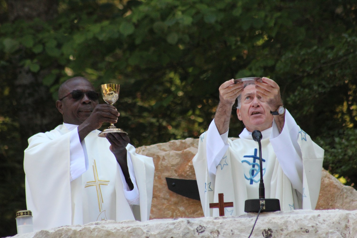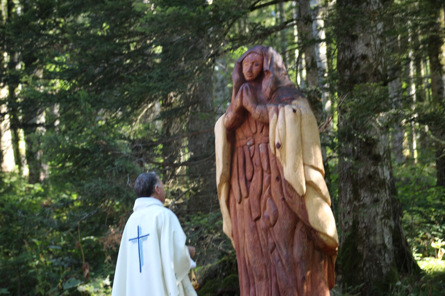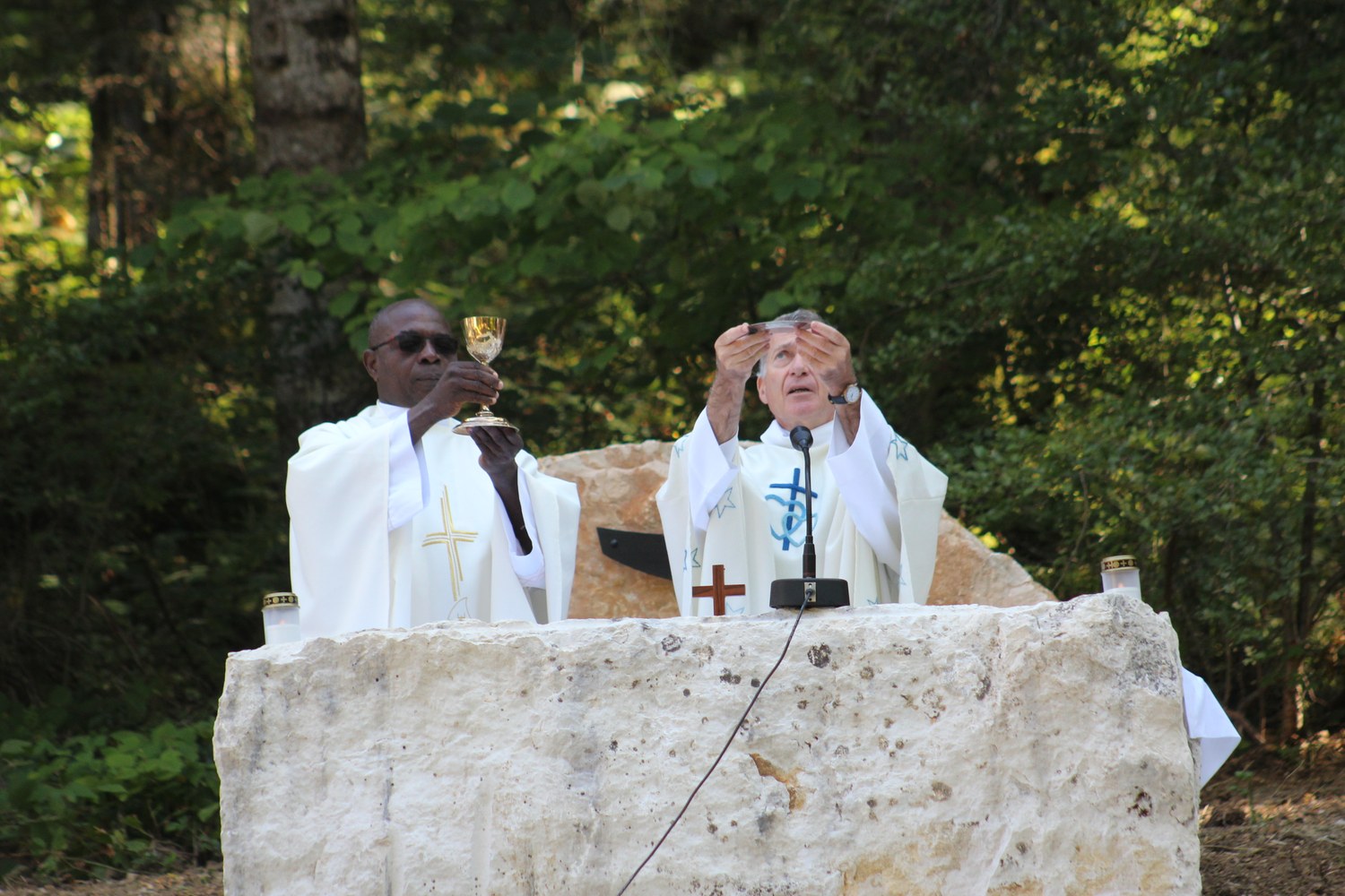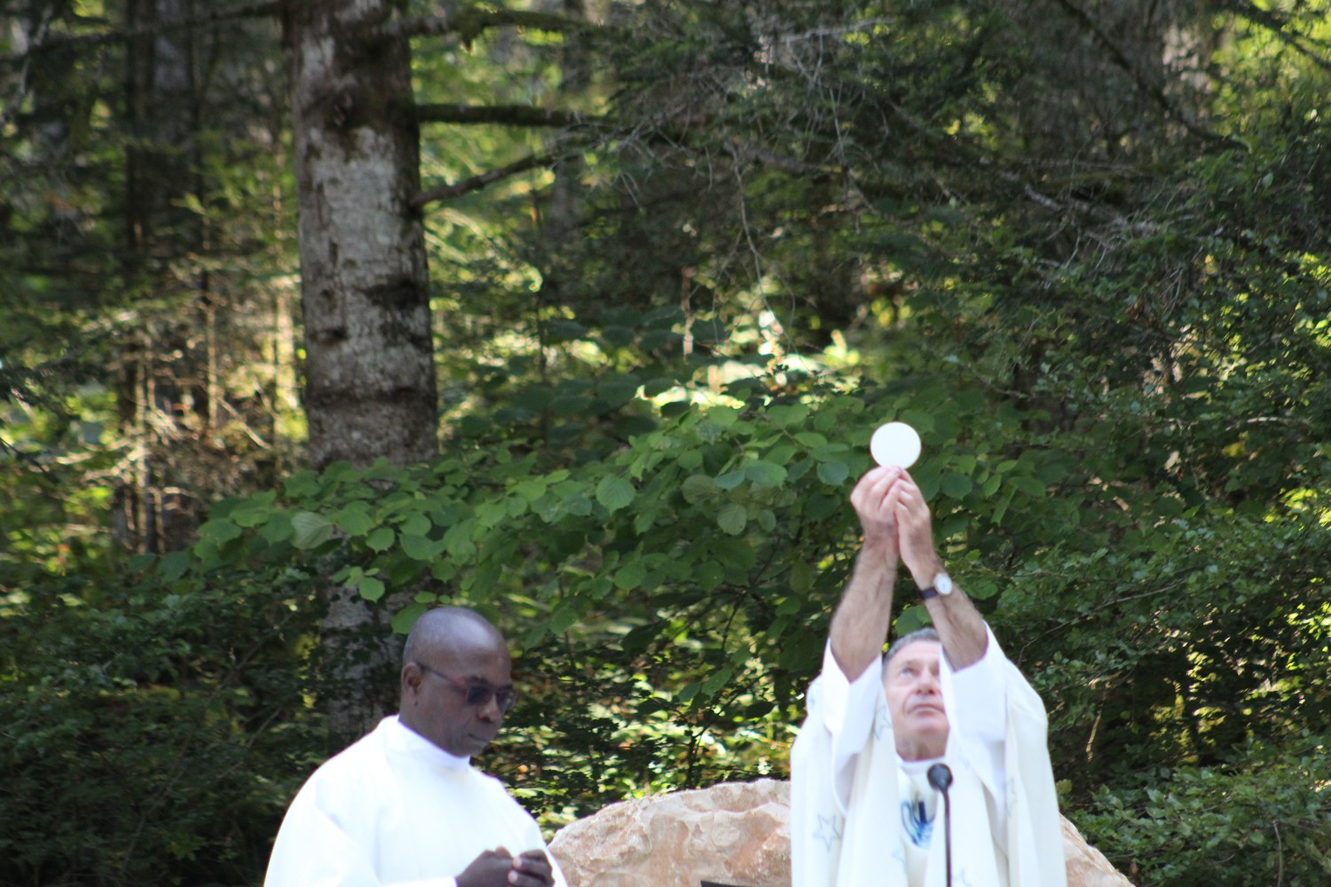 C’est ainsi que l’autel extérieur installé sur l’esplanade et la nouvelle statue ont pu être bénis par le Père Pelletier,vicaire général, invité tout exprès par le Père Rufin, à célébrer une messe sur le site pour fêter la Nativité de la Vierge.Cette manifestation organisée dans la précipitation et annoncée au tout dernier moment, a cependant rencontré un beau succès.Le temps radieux et le site ont attiré environ 60 personnes qui ,avec monsieur le maire, ont félicité chaleureusement les travailleurs en partageant des boissons à l’issue de la cérémonie.