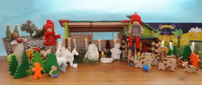 Voici en image la crèche de la famille Parmentier avec les personnages fabriqués par Bleuenn et Nicéphore.