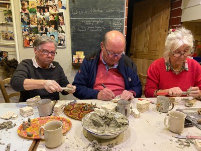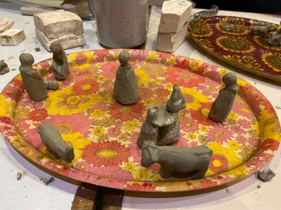 A la demande de plusieurs paroissiens et personnes sympathisantes et en fonction des disponibilités, un atelier de santons s’est mis en place chez nous. Nous fournissons les moules, l’argile et la cuisson au feu de bois ! Il y a déjà eu deux séances.