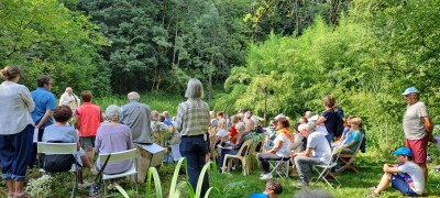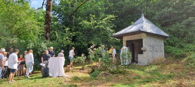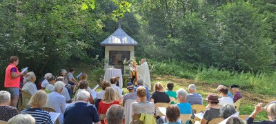 Eucharistie à la Fontaine Bénite de Chezery. C'est un oratoire de 1648 en l'honneur de Saint Roland dont les reliques reposent dans l'église de Chezery.