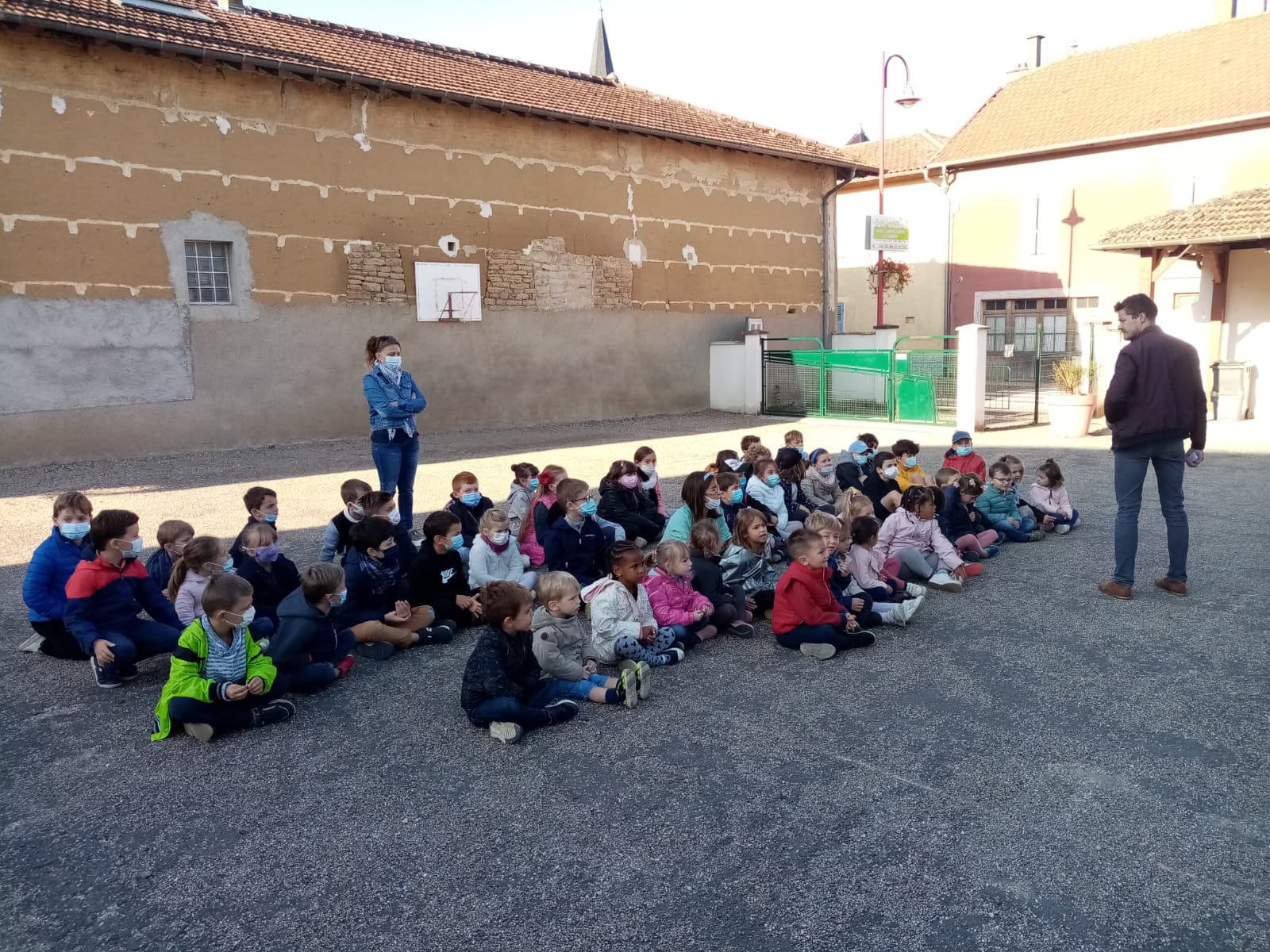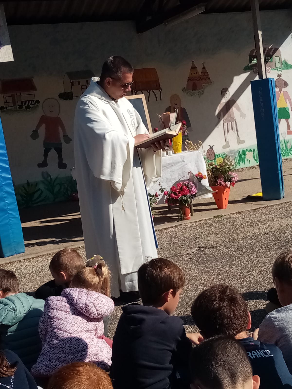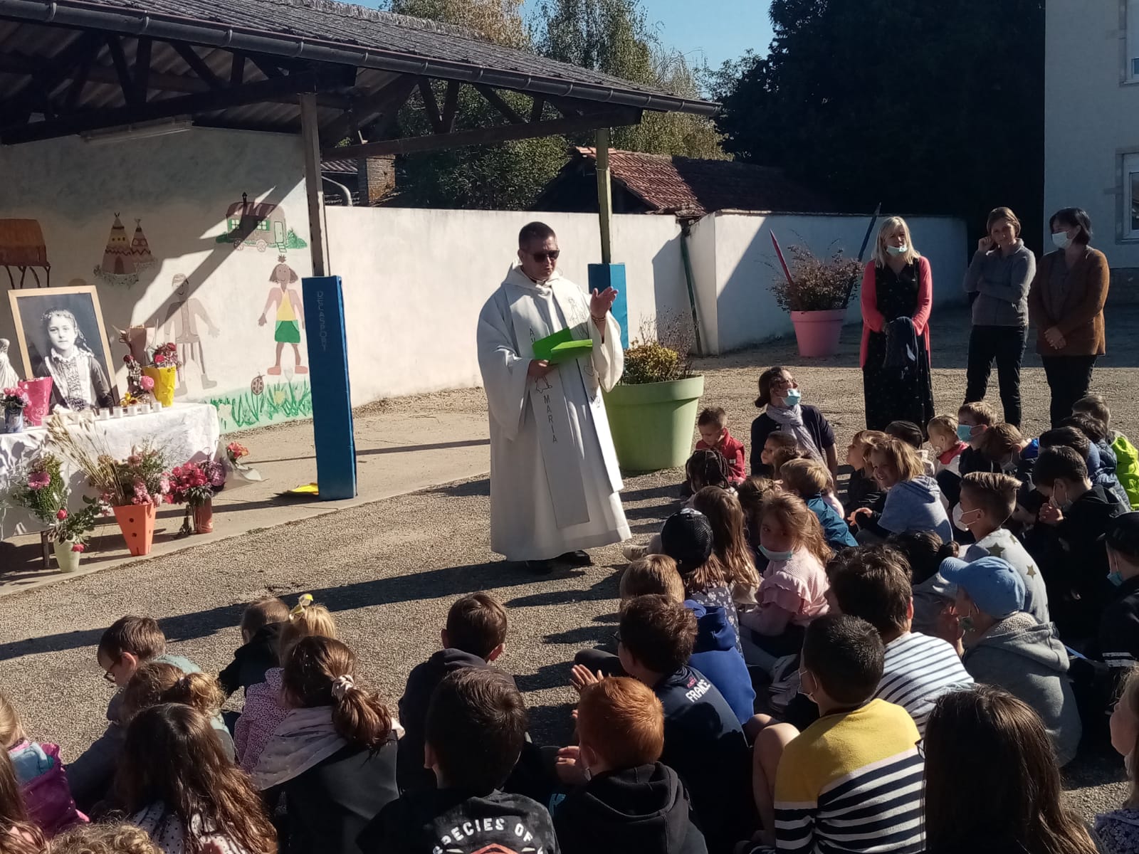 Après 2 heures de jeu de piste qui leur a permis de faire connaissance avec la vie de Sainte Thérèse et de retrouver des objets disparus, les élèves, leurs professeurs, leur directeur, les parents et le Père Olivier se sont rassemblés dans la cour de l'école pour une belle celebration.