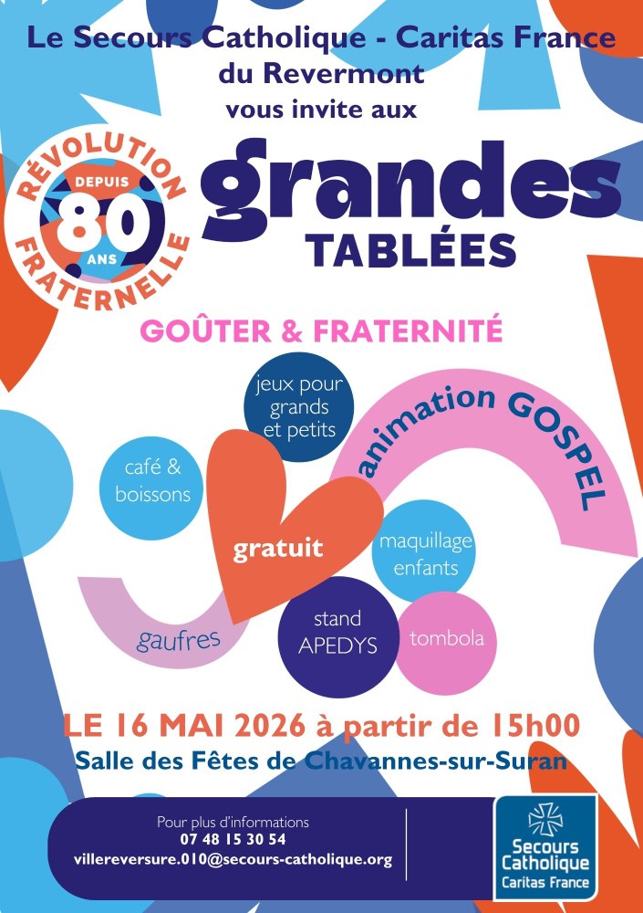 Le samedi 16 MAI à partir de 15 H 00 place de la salle des fêtes de CHAVANNES sur SURAN, l’antenne REVERMONT du SECOURS CATHOLIQUE / CARITAS