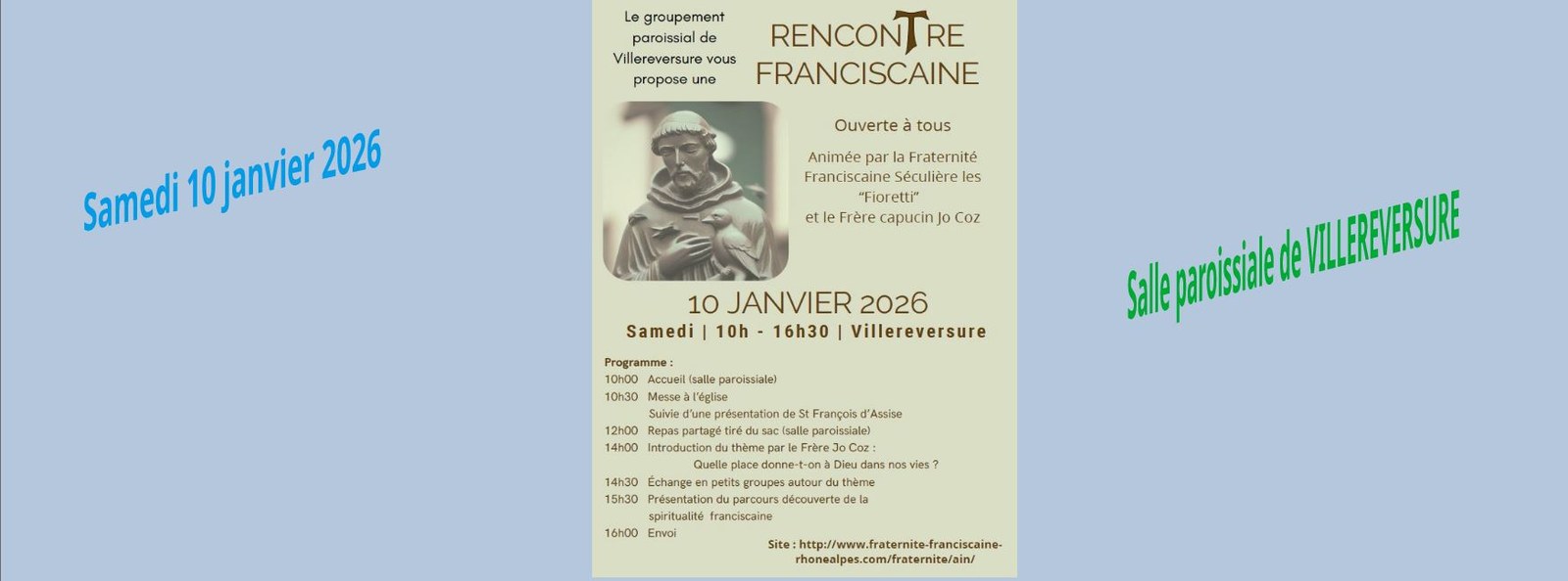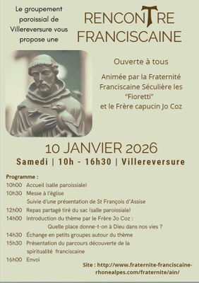 Pour faire vivre ce thème d'année pastorale et découvrir la spiritualité de saint François, notre groupement paroissial vous propose une rencontre franciscaine le samedi 10 janvier 2026 à Villereversure à partir de 10H00.