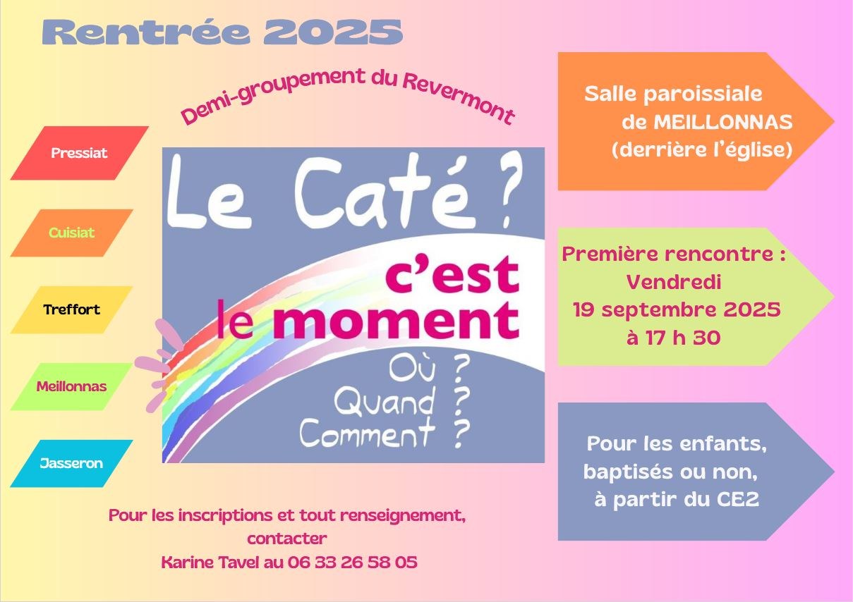 Pour le demi groupement du Revermont la rentrée des catés approche, nous vous donnons rendez-vous pour les inscriptions le 19 septembre à 17H30 à la salle Paroissiale de Meillonnas.